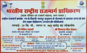 बालाघाट के सांसद डॉ. ढाल सिंह बिसेन की फेसबुक वाल पर भारतीय राष्ट्रीय राजमार्ग प्राधिकरण का एक पोस्टर चस्पा है। इसके मुताबिक भारत सरकार के सड़क परिवहन एवं राजमार्ग मंत्रालय के द्वारा राष्ट्रीय राजमार्ग क्रमांक 44 के सिवनी नागुपर अनुभाग के मोहगांव से खवासा खण्ड के चार लेन सड़क चौड़ीकरण/उन्नयन परियोजना जिसकी लंबराई 29 किलोमीटर एवं लागत 968 करोड़ रूपए है का लोकार्पण केंद्रीय सड़क परिवहन एवं राजमार्ग मंत्री नितिन गड़करी के द्वारा 16 सितंबर को शाम 07 बजे किया जाएगा।