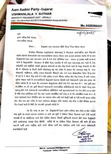 આમ આદમી પાર્ટીના માયનોરેટી પ્રમુખ દ્વારા મોડાસા નગરપાલિકાના સીસી રોડ બનાવતા કોન્ટ્રાક્ટરોના પેમેન્ટ રોકવા બાબતે મોડાસા નગરપાલિકા ના મુખ્ય અધિકારી શ્રી ને એક પત્ર પાઠ્વ્યો