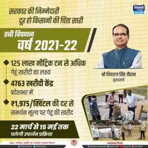 मुख्यमंत्री श्री चौहान ने बताया कि पिछले वर्ष कोरोना काल में किसानों की सुविधा के लिये उपार्जन केन्द्रों की संख्या बढ़ाई गई थी। इस बार 4763 केंद्र पर उपार्जन की व्यवस्था की गई है। सभी उपार्जन केन्द्रों पर किसानों के लिये माकूल व्यवस्थाएँ भी की जा रही हैं। मुख्यमंत्री श्री चौहान ने किसानों से अपील की है कि वे निश्चिंत होकर अपना गेहूँ उपार्जन केन्द्रों पर लाए। सभी किसानों के गेहूँ का एक-एक दाना सरकार खरीदेगी। इस बार समर्थन मूल्य पर 125 लाख मीट्रिक टन गेहूँ उपार्जन का अनुमान है। अभी तक 24 लाख 58 हज़ार किसानों ने गेहूँ उपार्जन के लिए पंजीयन कराया है। इस बार गेहूँ का समर्थन मूल्य 1975 रुपए प्रति क्विंटल होगा। गत वर्ष यह 1925 रुपए प्रति क्विंटल था।