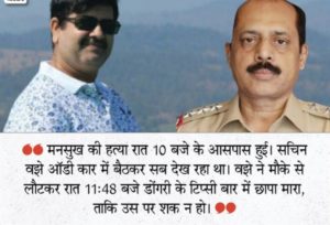 सचिन वझे ने ही मनसुख को ‘तावड़े’ नाम से वॉट्सऐप पर कॉल करके बुलाया था। दोनों की बातें मनसुख की पत्नी विमला ने सुनी थीं।