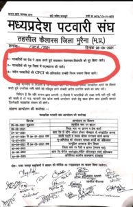 जिसमें प्रमुख मांगों में बताया गया कि पटवारियों की ग्रेड पे 2800 एवं समय मान वेतनमान की विसंगतियों को दूर किया जाए तथा पटवारियों की गृह जिले में पद स्थापना की जाए एवं नए पटवारियों की सीपीसीटी अनिवार्यता संबंधी नियम निरस्त किए जावे मांगों का निराकरण शीघ्र ना होने पर आंदोलन की विस्तृत रूपरेखा विज्ञापन में प्रस्तुत की गई ज्ञापन में प्रमुख रूप से पटवारी जिला संघर्ष समिति के अध्यक्ष राम कुमार धाकड़, प्रदीप इक्का, माखन अर्गल, नरेंद्र टुडेलकर, केके मुद्गल, सतीश धाकड़, भारत राजपूत, उपेंद्र करेरिया, सुरेंद्र मीणा, विवेक जादौन ,राधेश्याम शर्मा, आदि पटवारी गण विशेष रूप से उपस्थित रहे।