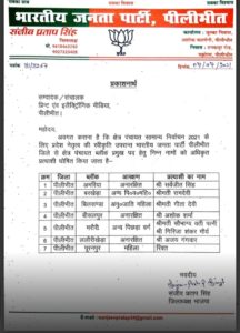 पीलीभीत में भाजपा ने अपने पत्ते को खोलें,जनपद के सभी ब्लॉक प्रमुख पद प्रत्याशियों को किया गया घोषित।
